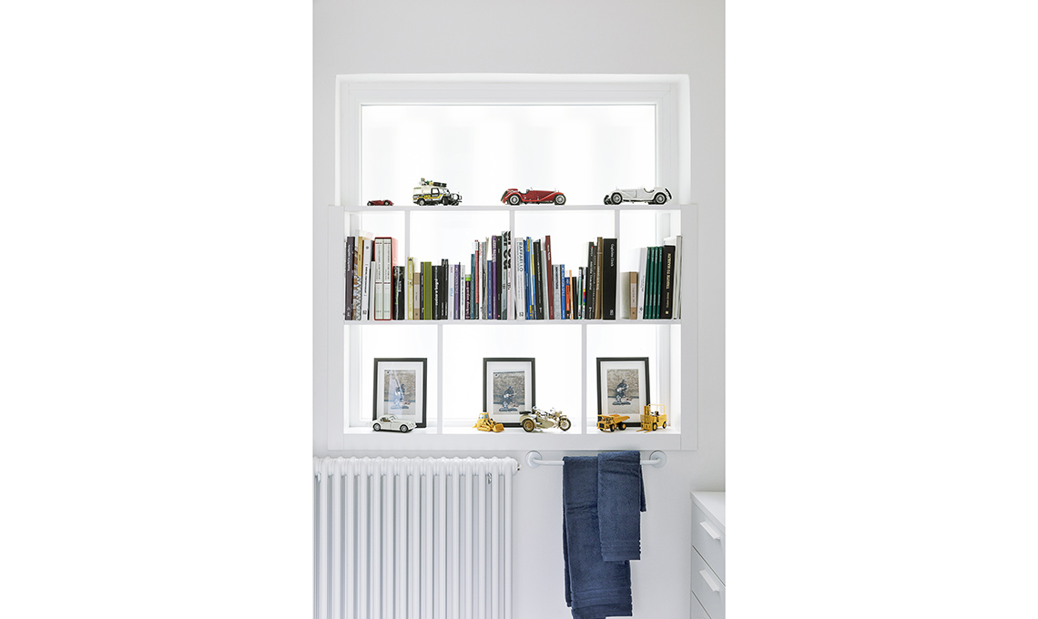 La finestra con affaccio sulla strada è schermata da una libreria con la collezione di macchinine di Fabio.