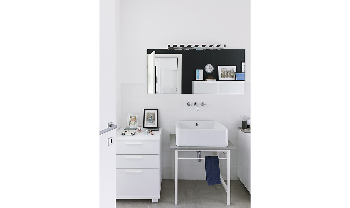 Lavabo d’appoggio [Ceramica Cielo] su base di ferro verniciato bianco, realizzata su disegno [Stilfer]. Asciugamani Coccola colore Quetzal [Fazzini], cassettiera e specchio con luce [Custom by BM Italia].