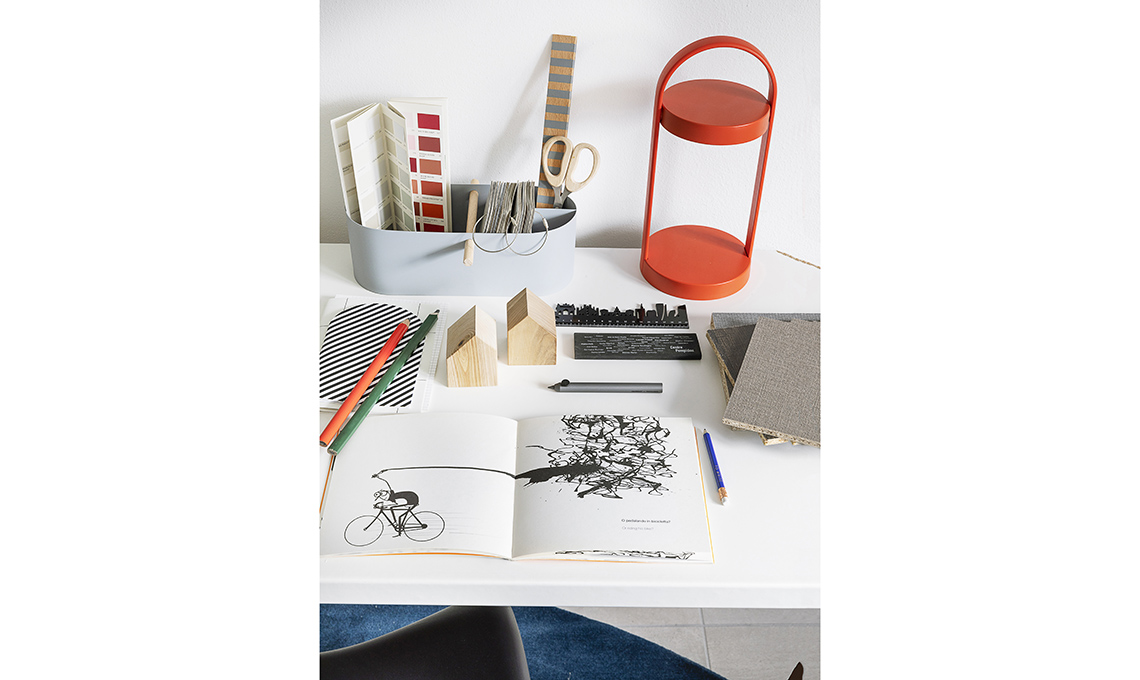 Sulla scrivania organizer Everyday Box [Hiro, cm 30x10x20 € 49]. Lampada wireless ricaricabile Giravolta [Pedrali, ø cm 15x33h € 222], quaderni [Write Sketch &].