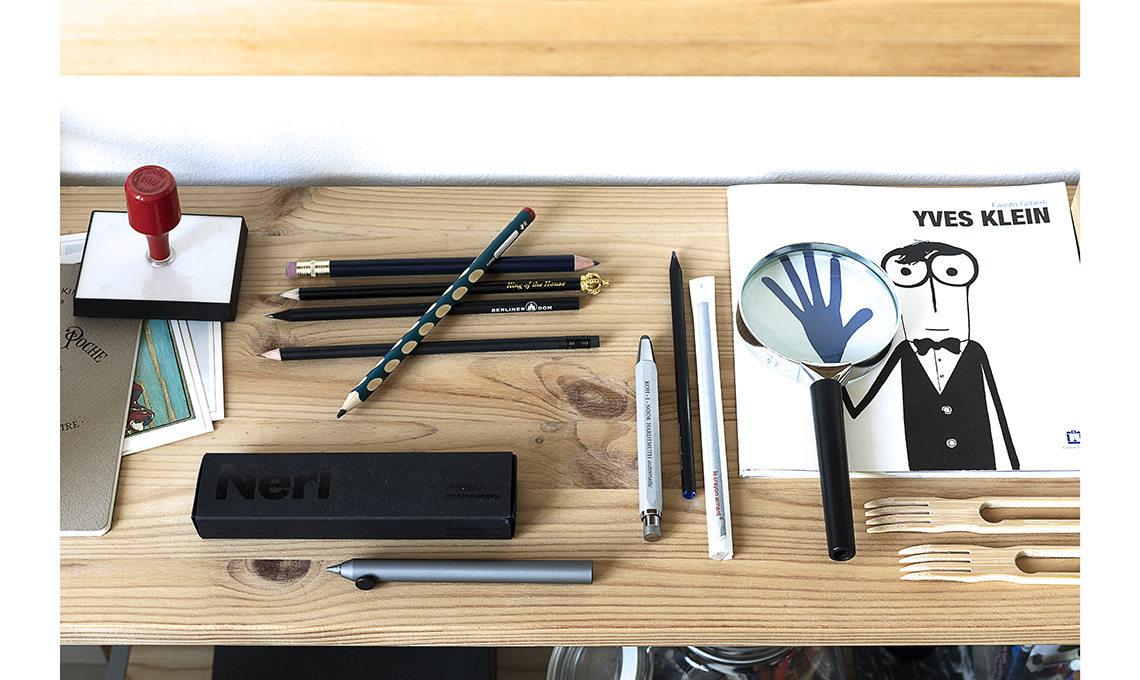 Oggetti di design anonimo, come la collezione di matite, bozzetti, materiali e progetti convivono nello studio del designer. Tra questi il primo prototipo della culla ’dalla Vite alla Vita’, progetto poi realizzato da Riva 1920 per la riqualificazione