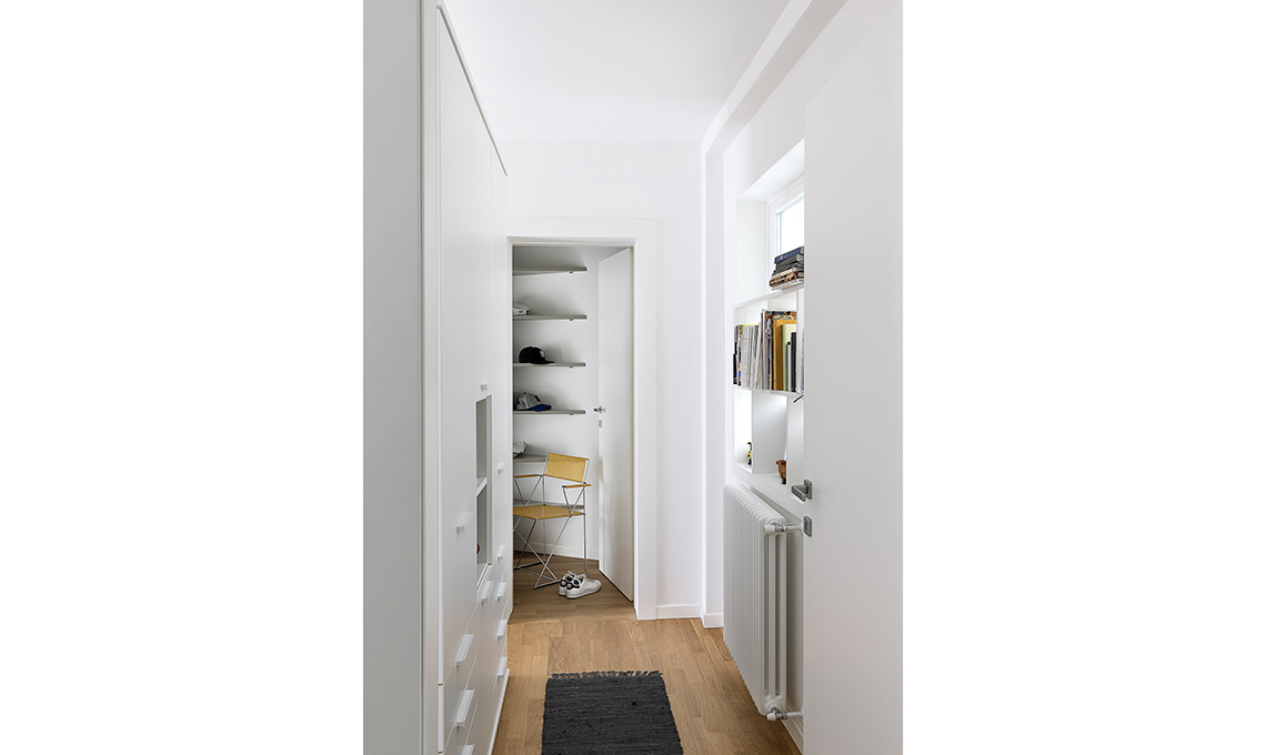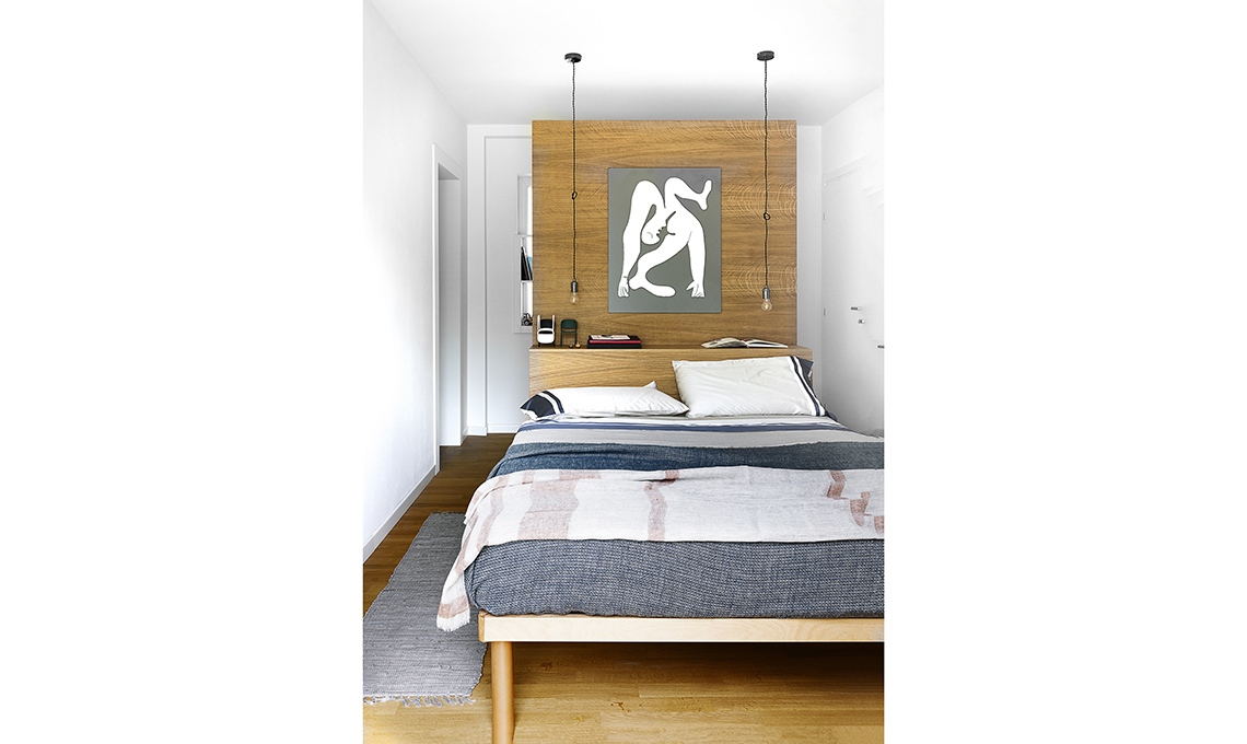 L’armadiatura sul retro della testata del letto crea un corridoio schermato che porta alla cabina armadio, ricavata nell’allargamento della struttura originaria della casa.