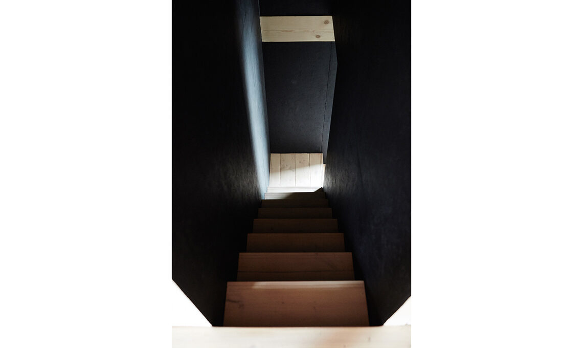 Osare colori scuri negli ambienti piccoli dona carattere alla casa. I pannelli OSB (Oriented Strand Board, ‘pannello di scaglie orientate’) della scala, per esempio, sono stati verniciati con un prodotto ecocompatibile nero opaco.