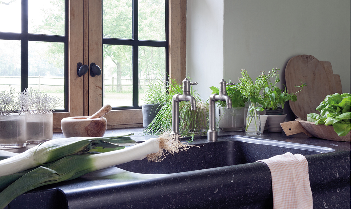 Sulla parete, spicca il blu scuro della pietra locale che fa da sfondo a una preziosa cucina in ghisa.
