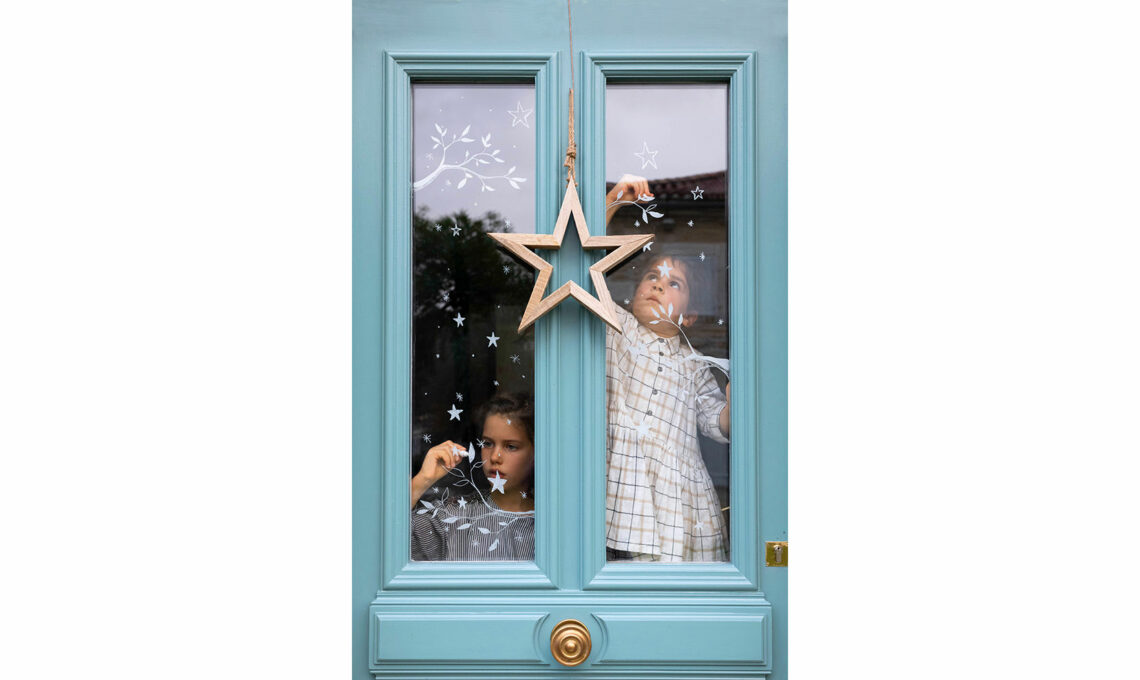 Decora le finestre con i pennarelli per vetro cancellabile. Se non ti senti sicuro nel disegno a mano libera, disegna le stelle e i decori su fogli di carta e fissali con il nastro adesivo all’esterno dei vetri.