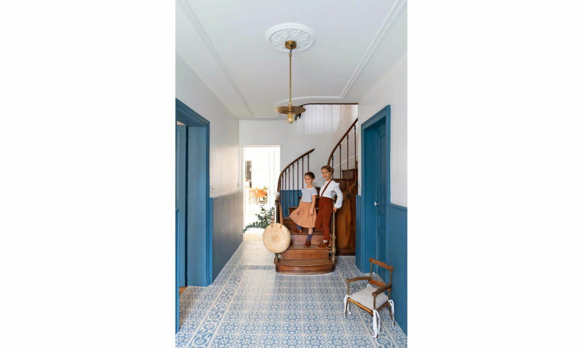 Gli stucchi e le piastrelle decorate in blu sembrano tessere un tappeto all'ingresso. Sono un omaggio alle case francesi del XIX secolo. In blu scuro le porte e la boiserie.