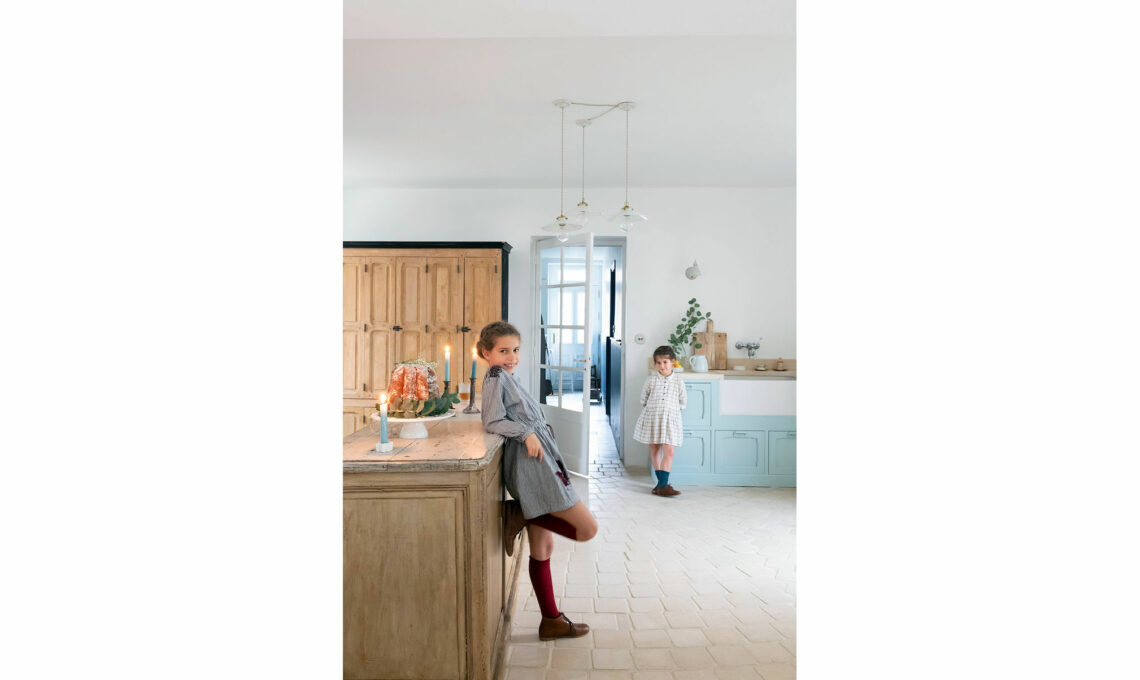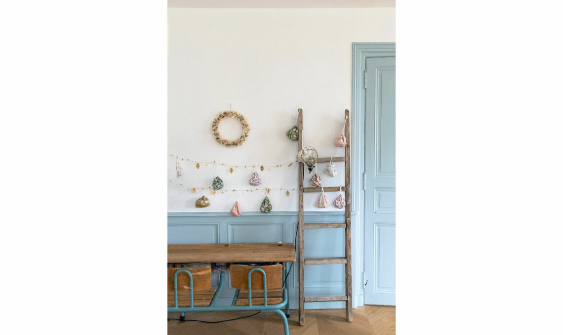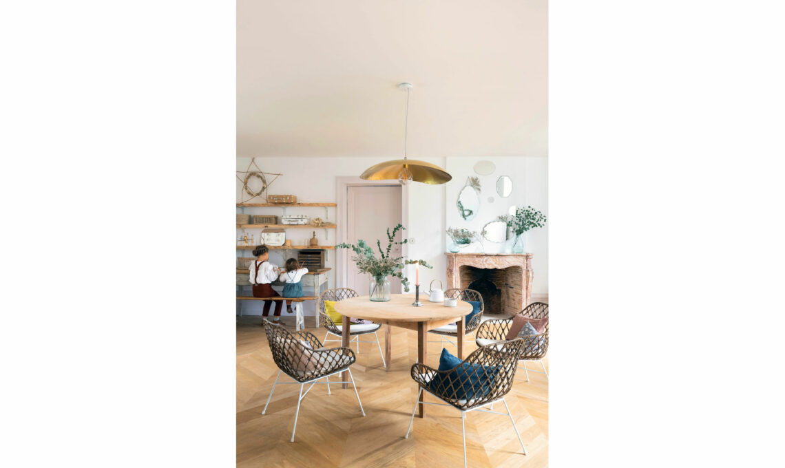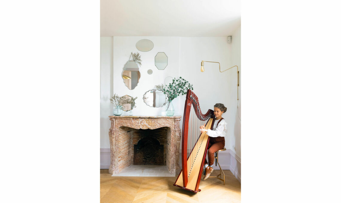 Durante i giorni di attesa del Natale, accanto al camino di marmo rosa, viene allestitala ‘stanza della musica’, come ama definirla Hélène. È qui che la piccola Hermïone si esercita intonando con l’arpa i tradizionali canti natalizi per la vigilia. Applique a braccio Swing in ottone lucido [House Doctor, com 70 € 215].
