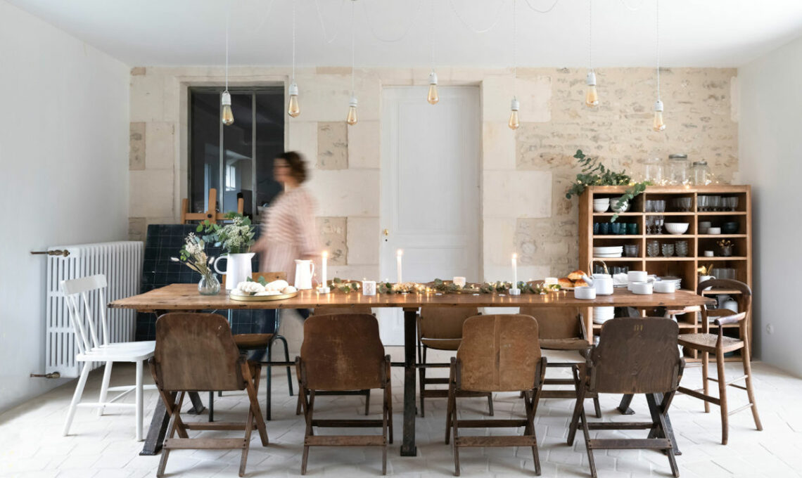 Il lungo tavolo conviviale è assemblato con cavalletti di ferro acquistati da un fabbro e l'anta di un vecchio armadio come piano. Tutto intorno, sedie vintage da cinema. L'intonato lasciato a vista non è stato rasato, ma dipinto color crema. Credenza con ripiani a vista [La Petite Broncateuse].