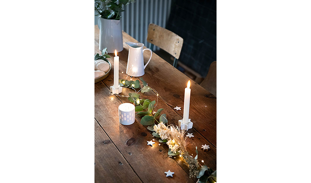 Le lucine, le stelline di ceramica sparse qua e là e le candele accendono l’atmosfera.