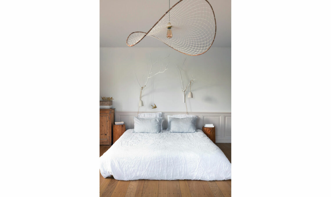 Il letto appoggiato sulla pedana sfrutta la boiserie grigio perla come testata, a cui si aggiungono due rami sbiancati che reggono lampade in ceramica. Come comodini, perfetti due tronchi di legno. Sospensione Mila, con telaio curvato in rattan e rete intrecciata a mano. Ogni lampada è un pezzo unico [Lovmint, ø cm 80 €139].