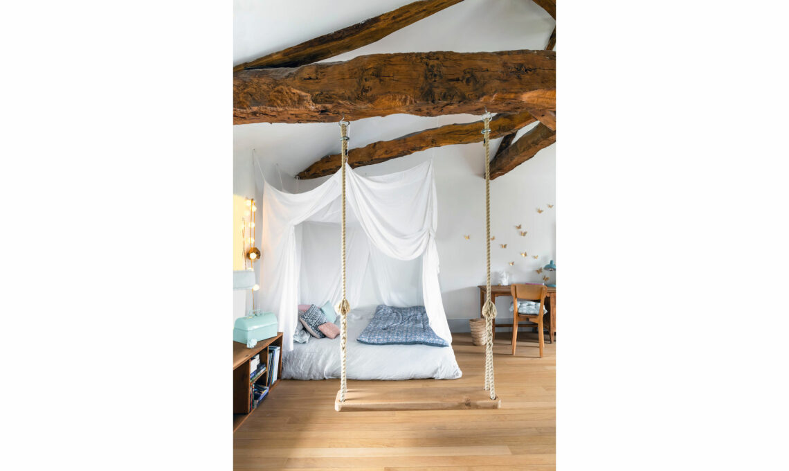 Il baldacchino da 'mille e una notte' è fissato con i tiranti. L'altalena in camera è il regalo di papà Antoine per i piccoli di casa.