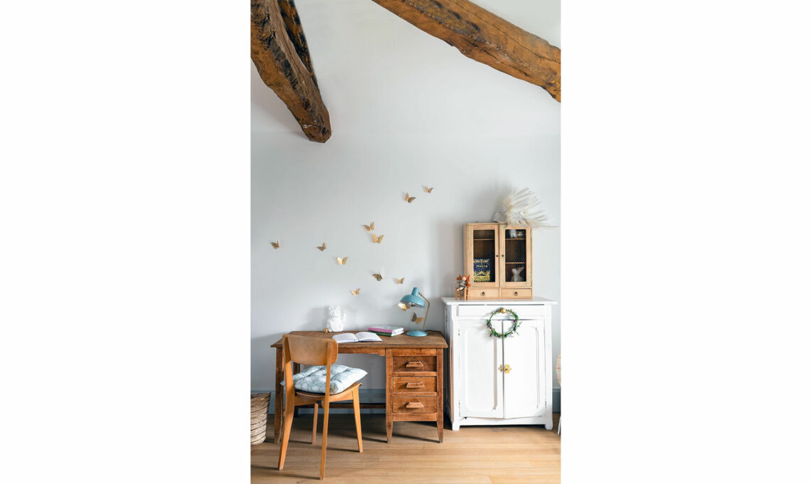Farfalle oro (le ha realizzate Hélène con il lamierino) decorano le pareti, lasciate bianche per moltiplicare la luce.