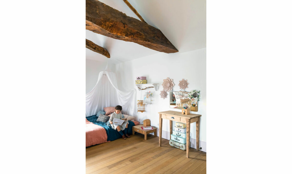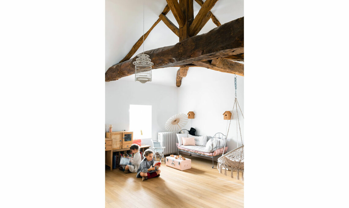 Il sottotetto con le travi originali è il rifugio dei bimbi. Gli scrittoi, i lettini di ferro, le gabbiette e le poltrone sospese sono vintage.