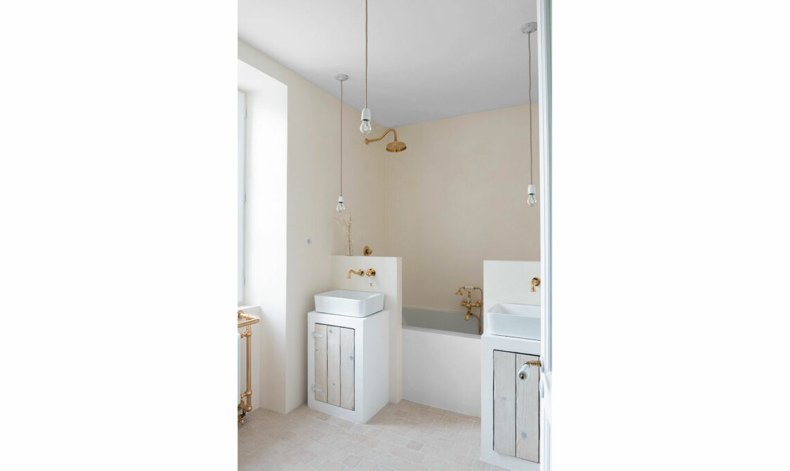 Legno sbiancato, pietra e rubinetteria ottone nel bagno padronale. La vasca è schermata da una coppia di postazioni gemelle con vecchi armadietti ridipinti e attrezzati con lavabi d’appoggio.