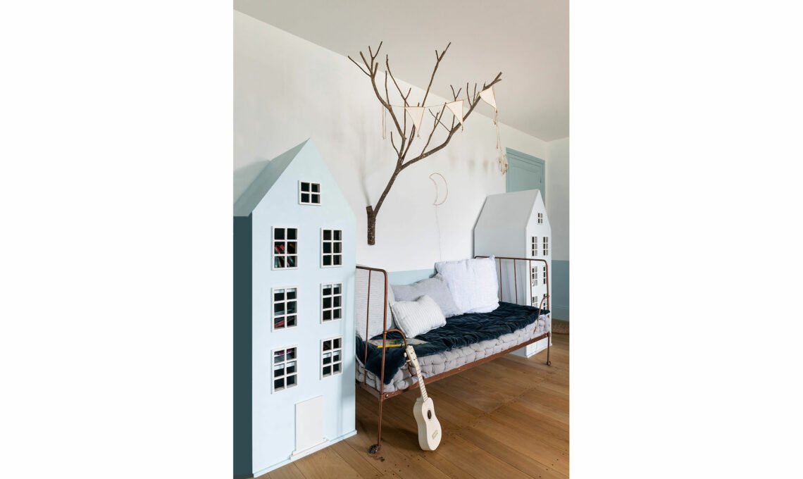 Sul lettino in ferro vintage materassi [Maisons du Monde e Bouchara]. Ghirlanda con bandierine [Numero 74]. Gli armadi hanno la forma di casette con tanto di finestrelle e sembrano usciti da un libro di fiabe.