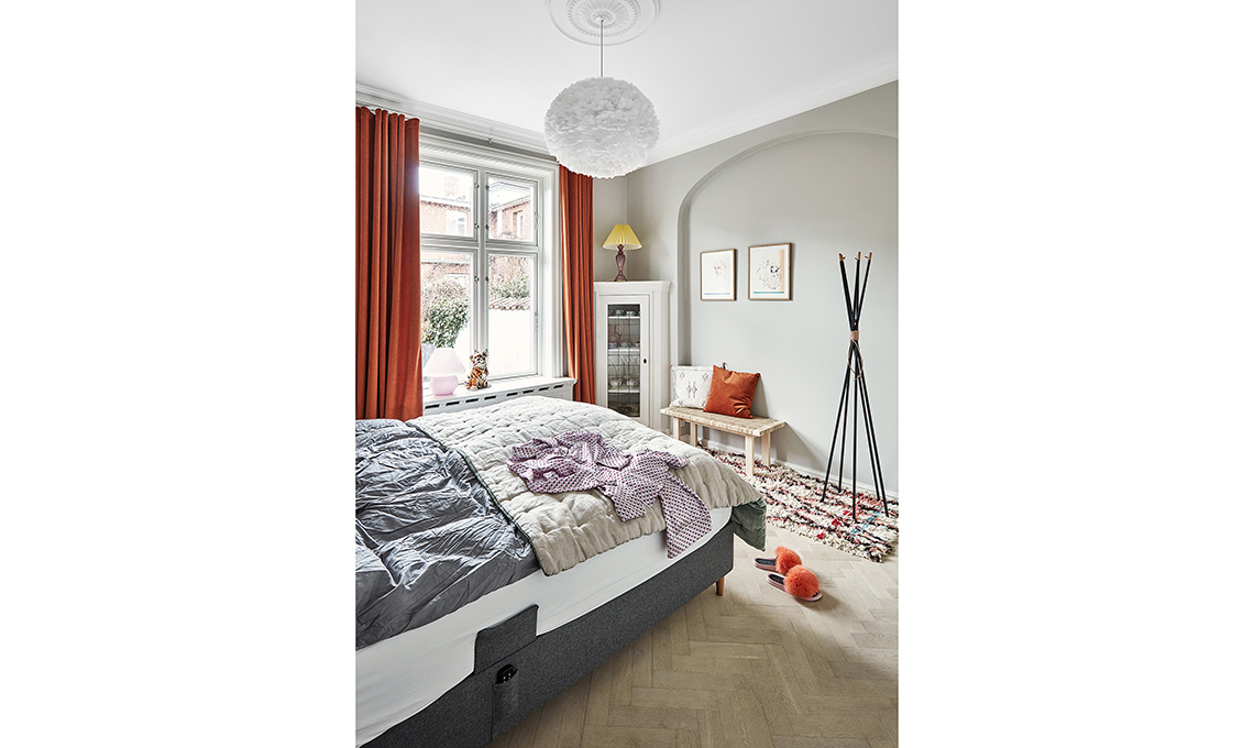 In questa casa le tende, quando ci sono, hanno grammature e colori importanti: grigie nel living, rosa in biblioteca, aragosta in camera.