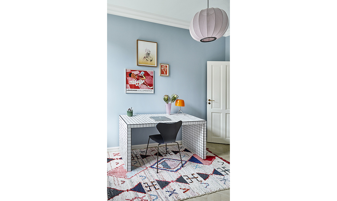 Luce da tavolo Lumiere [Foscarini €350], sedia Serie 7 [Republic of Fritz Hansen]. La scrivania più basica di Ikea è stata rivestita di piastrelle, con un effetto che si ispira all’iconica collezione Quaderna [Zanotta].