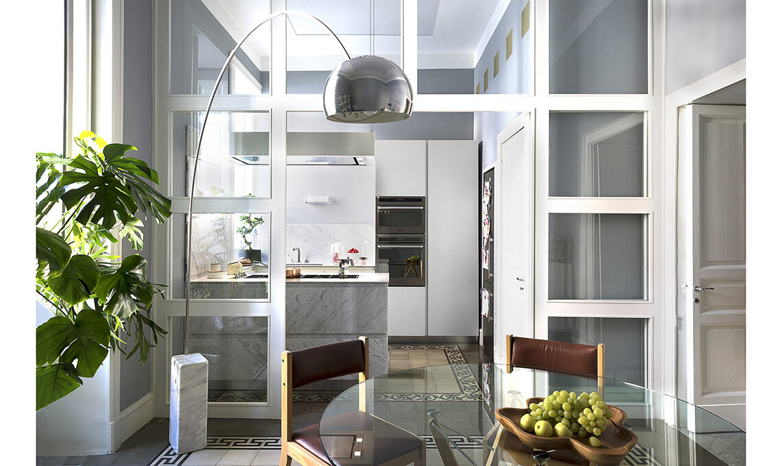 La zona pranzo è un tutt’uno con la cucina, separata solo all’occorrenza da una grande porta in vetro e legno.