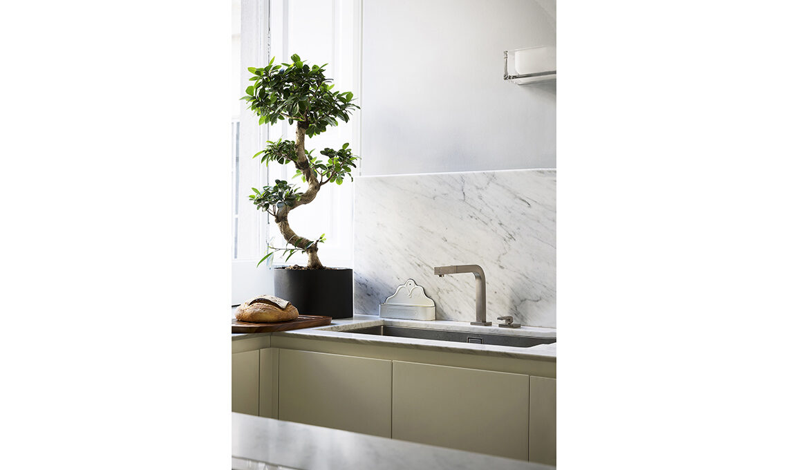 La cappa tecnica in aacciaio dal sapore hi-tech, è un volume che quasi scompare, sospeso sulla penisola. Sul piano, pentola [KnIndustrie] e bollitore Plissé in bianco, design Michele De Lucchi [Alessi da € 79].