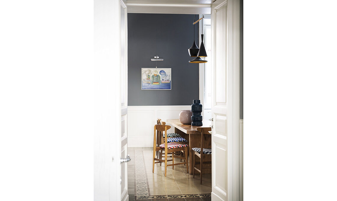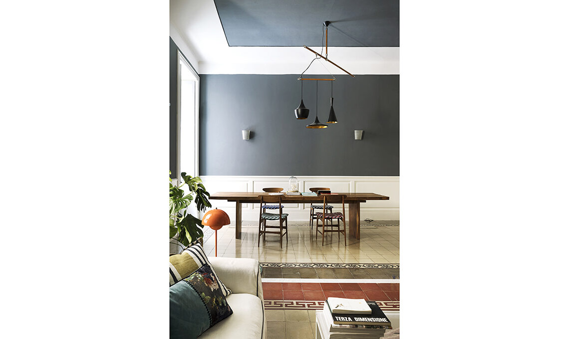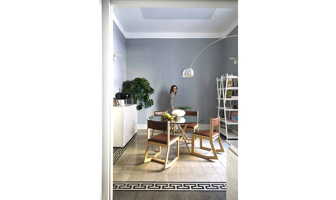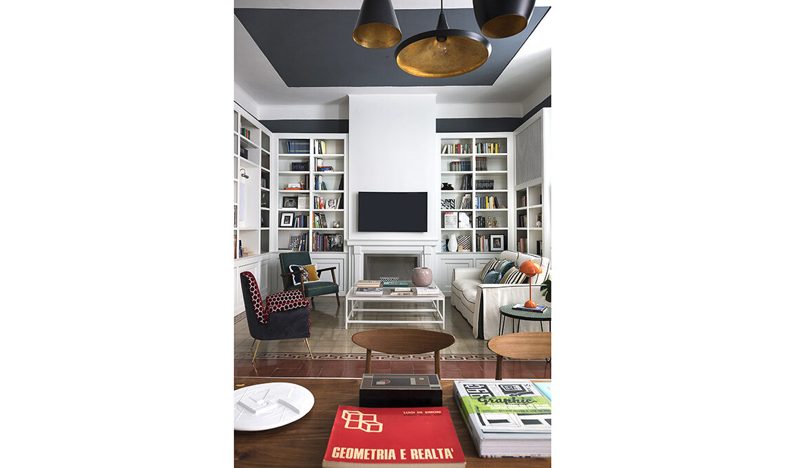 Sedie e poltroncine Gemma e Jim, recuperate e ritappezzate da [Blanco Tappezzeria da € 1.300], sospensioni Beat [Tom Dixon da € 460], applique e piantana Mite [Foscarini da € 1.011,38]. A destra, piante [Ikebana].