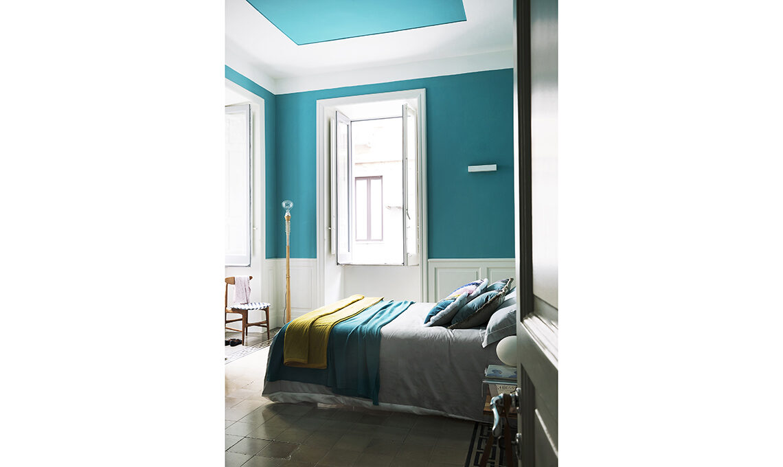 Coffee-table con piano azzurro [Blanco Tappezzeria €400], luce da tavolo Flowerpot [&Tradition da Mohd, da €166].