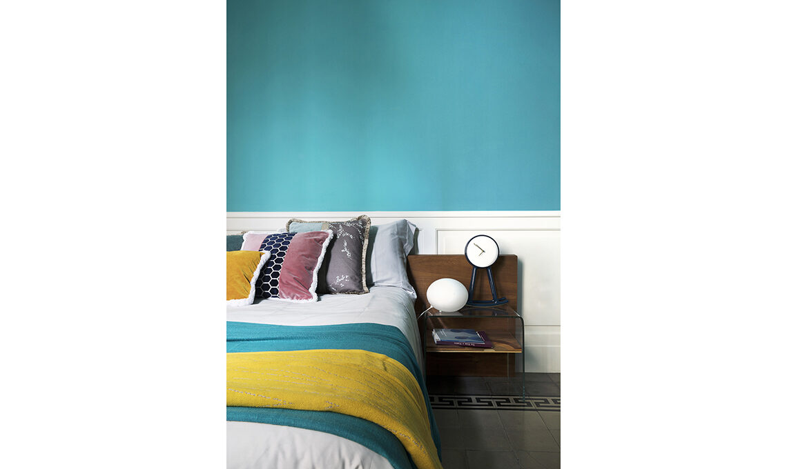 Cuscini decorativi [L’Opificio] sul letto Air [Lago], plaid Il Pleut [Lanificio Leo€280], comodini Bifronte[Horm€590], orologio da tavolo Infinity Clock [Bosa, da Silluzio Arredamenti €650 circa], lampada da tavolo [Papelù].