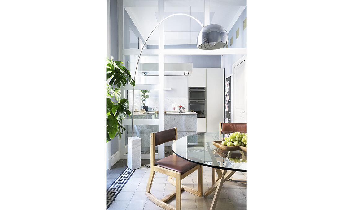 Lampada da terra Arco [Flos da € 2.250], tavolo Orione di Roberto Barbieri per [Zanotta da € 2.922], sedie di recupero,