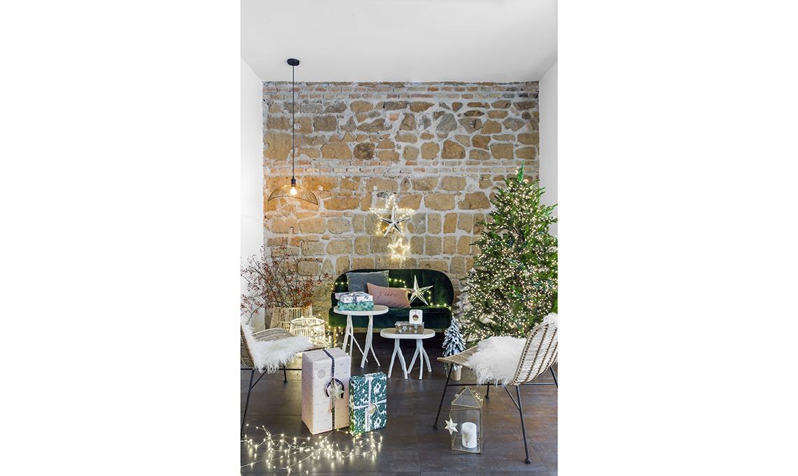 Divanetto [Materia], cuscini, tavolini e libri [Galleria Mia]. poltroncine [Bloomingville], pellicce e stelle a Led [Fiorirà un Giardino]. ceste in rattan [Magazzini Forma & Memoria]; albero, pinetto, stelle a specchio e fili di lucine [EDG di Enzo De Gasperi].
