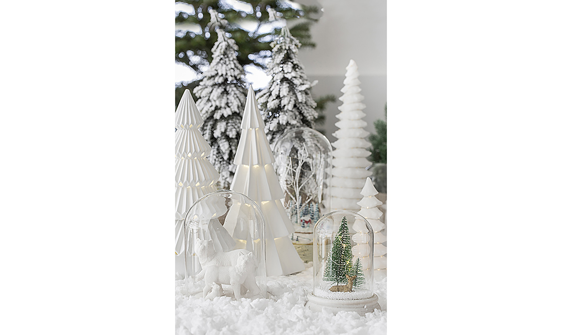 Pini innevati, alberelli in porcellana, abeti con microled e teche con animali [EDG di Enzo De Gasperi].