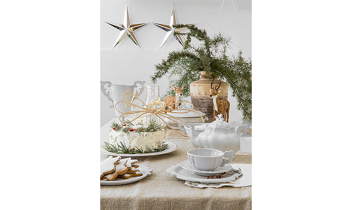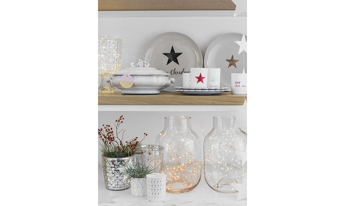 Vaso coppa treccia in cristallo EDG [Enzo de Gasperi, €7,50], Zuppiera [60 €] e piatti bianchi [72 €] in ceramica da Studio Forme. Piatti e tazze decorati [Bloomingville]. Cachepot in vetro cromato [EDG Enzo de Gasperi,€3,80], Vasi in vetro con le luci natalizie e bicchieri bianco e oro [tutto da Galleria Mia, Roma], ghirlanda con stelle [Fiorirà in giardino]