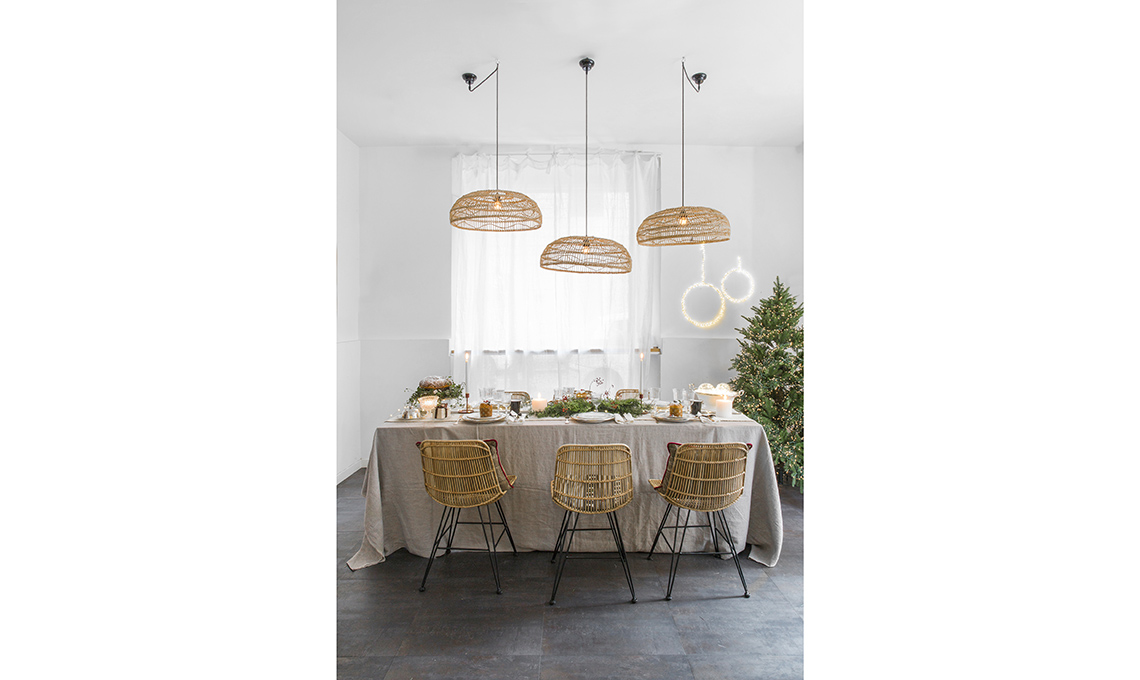 Sedie e sospensioni in rattan [Hk Living, da Materia], tende [Chez Moi], cerchi led e albero [EDG di Enzo De Gasperi].