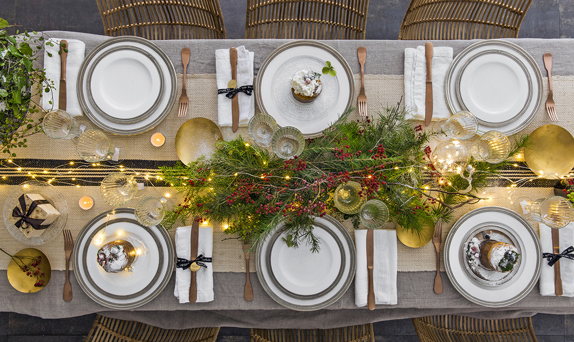 Tovaglia e tovaglioli in lino écru [Chez Moi], runner [Magazzini Forma & Memoria], portaburro, alzata e piatti in peltro e ceramica [Marinoni], calici [c.u.c.i.n.a.], bicchieri neri [Materia], posate rame [Bitossi Home], piatti in ottone dorato [Galleria Mia], candele, boules di vetro con led e fili di lucine [EDG di Enzo De Gasperi]. panettone, torrone e panettoncini [Giovanni Cova & C.], centrotavola con rami di pino e bacche [Peperosa Flowers].
