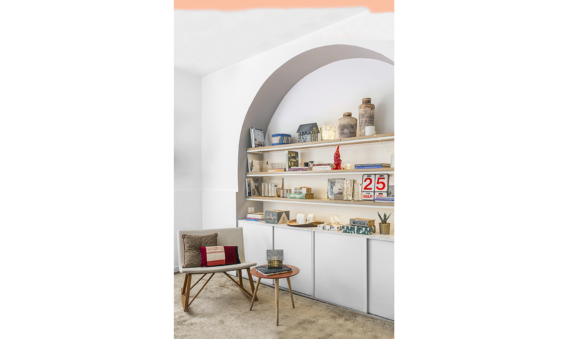 Sul tappeto [GT Design], poltrona a dondolo [Plinio il Giovane], con cuscini [L’Opificio]. tavolino [Materia], casetta luminosa [EDG di Enzo De Gasperi]. Sulle mensole: panettoni [Giovanni Cova &C.], casetta [Magazzini Forma & Memoria], vasi in legno [Shiina+Nardi Design], gnomo [c.u.c.i.n.a.], libri contenitori [Galleria Mia], calendario perpetuo [Danese], vassoio [Shiina+Nardi Design], casette di carta [Opificio Imaginarium], vasi e cesti [Materia].