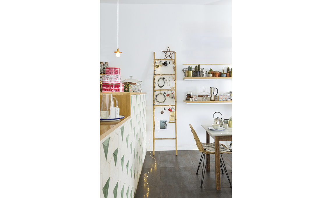 Sulla scaletta, non solo addobbi convenzionali: decori [c.u.c.i.n.a.], tazze e grattugia oro [Materia], festone di stelle e lucine [EDG di Enzo De Gasperi].