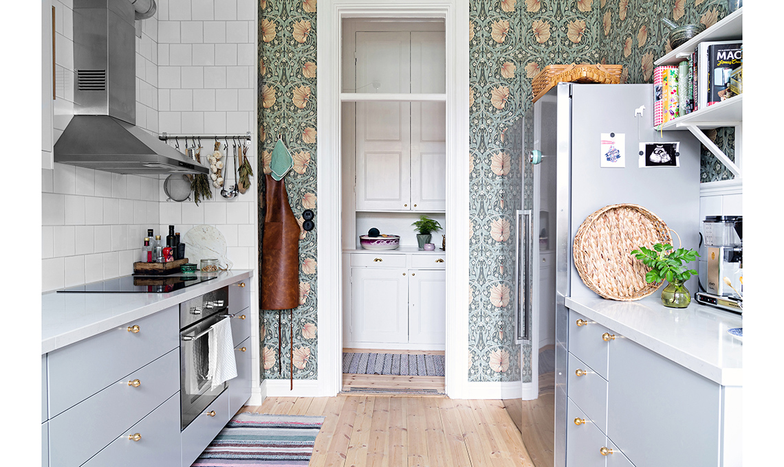 La wallpaper ’Pimpernel’ di [William Morris] incornicia la cucina in un rimando alle case vittoriane.