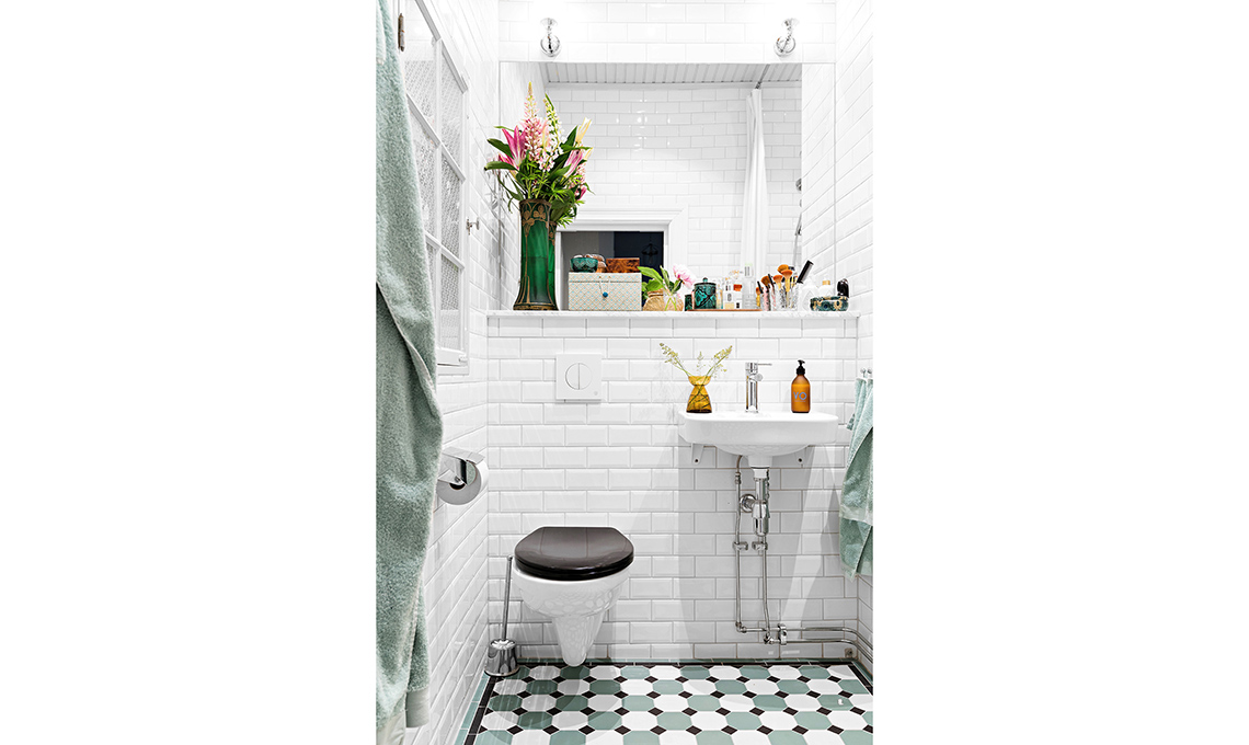 Il total white delle piastrelline diamantate è stemperato dal gioco grafico del pavimento. Qui, il design vintage delle piastrelle e l’uso del verde salvia dettano stile.