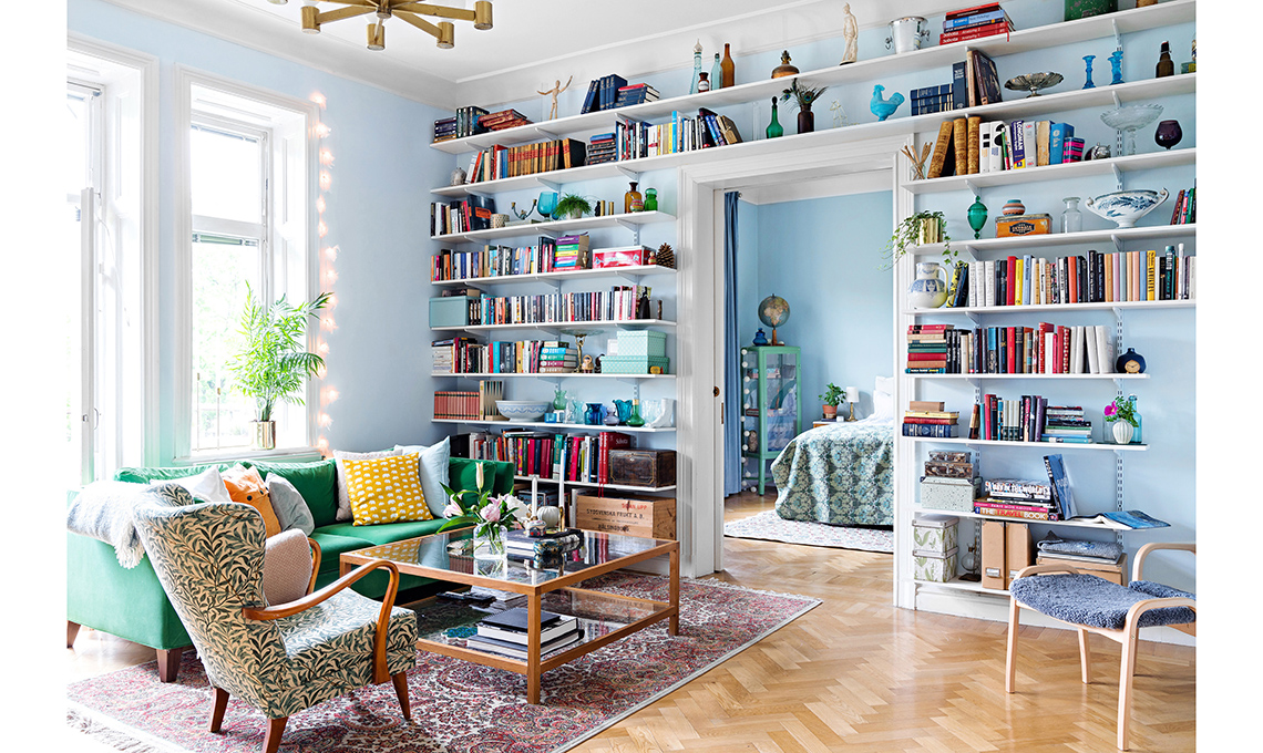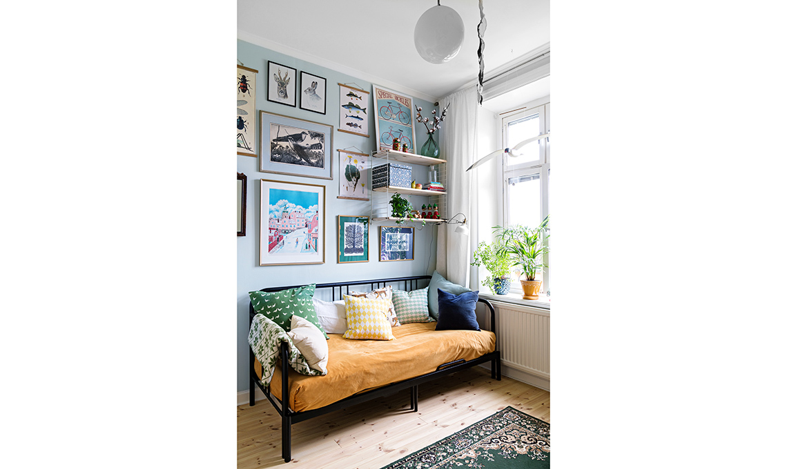 Sul divano Stockholm di velluto verde bottiglia [Ikea], un mix di cuscini colorati [Svenskt Tenn, H&M Home, Åhlens e Ikea]. La poltrona Anni ’50, scovata in un mercatino, è stata rivestita da Clara con il tessuto Willow Bough [William Morris]. Sul tavolino vintage, la collezione di portacandele di Clara [Skultuna, H&M Home, Voluspa].