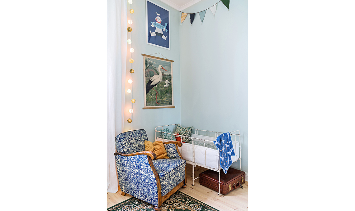 Il vecchio mobiletto di metallo azzurro accompagna Clara fin da quando era bambina. Dal giardino, pieno di attrezzi e cianfrusaglie, ha ora un posto d’onore in corridoio. Alla parete, una collezione di dipinti e stampe. Il paralume della lampada di ottone è stato rivestito da Clara con il tessuto ’Marigold’ di [William Morris].