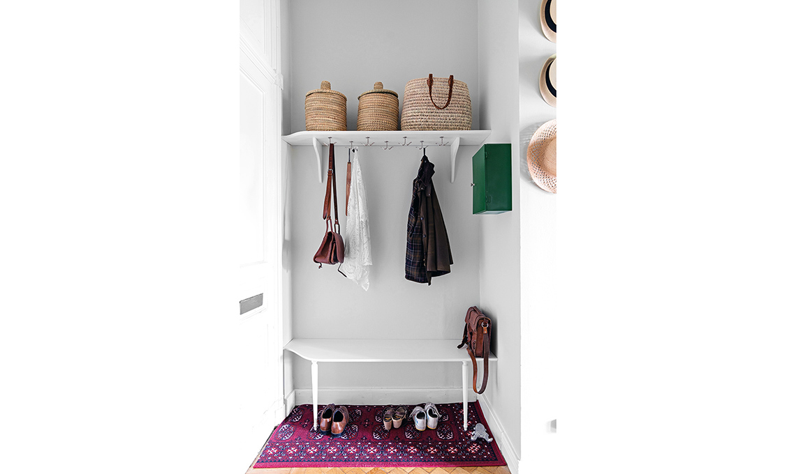 La nicchia attrezzata: dipinte di bianco, sembrano scomparire sulla parete. Fanno il paio con i cappelli di paglia, i cesti scovati in un suk a Marrakech. Verde prato l’armadietto per le chiavi, ereditato.