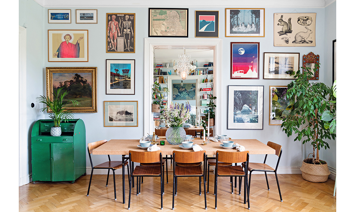 La sala da pranzo ricavata nell’ampio living acquista profondità con la maxi specchiera posizionata al centro della parete di fondo. Attorno, la collezione di stampe e quadri cominciata con pezzi di famiglia e poi arricchita negli anni.