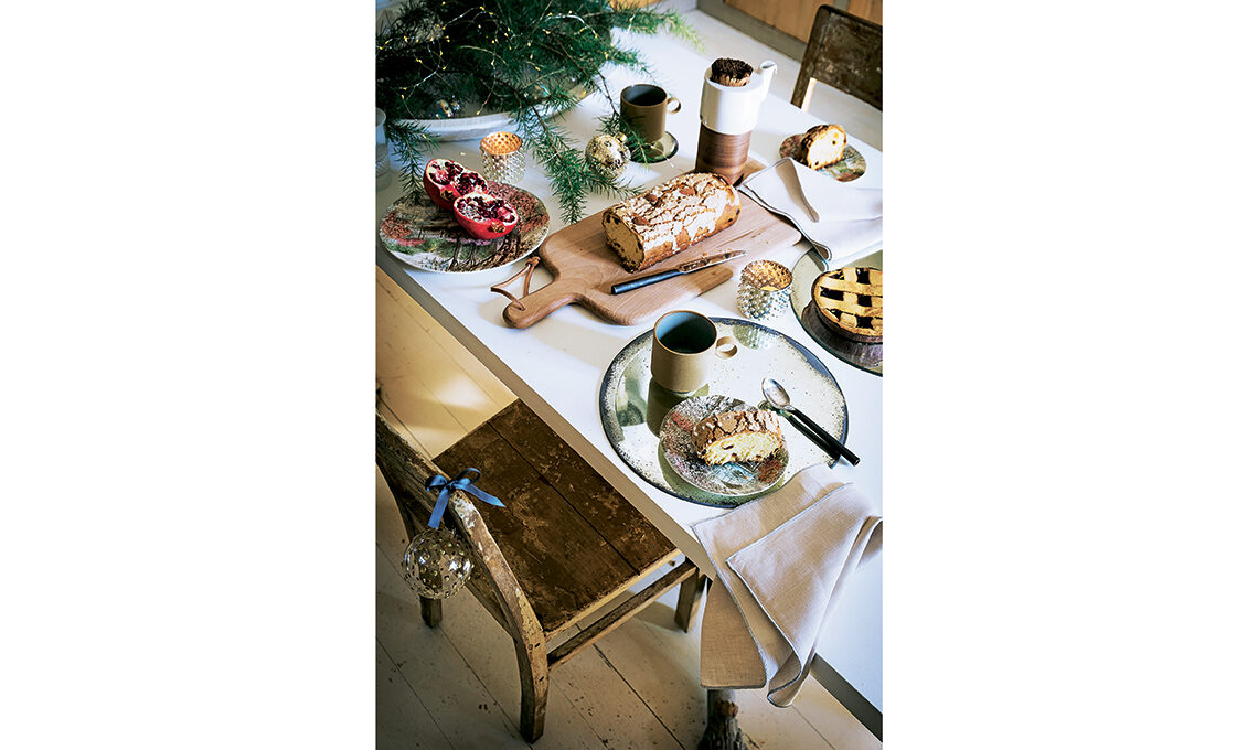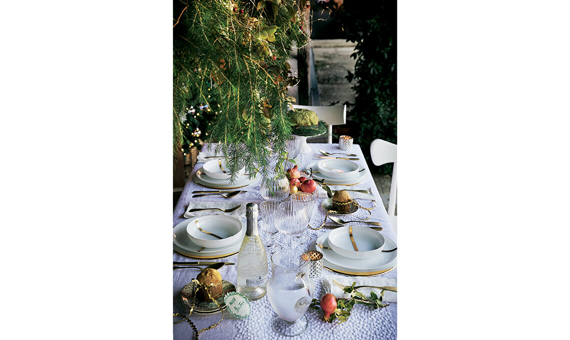 € 30], tutto in lino di [Society Limonta], posate in acciaio satinato finitura Gold [Borgo delle Tovaglie € 57 il set da 4 pezzi], sottopiatti e piatti collezione Gold [Les-Ottomans], calici, alzatina in ceramica bianca e portacandele in vetro argentato [Croff], panettone Pistacchio Matcha, linea Top Genesi [Loison, gr 600 € 22,70], spumante Cuvée Spumante Brut [Vini Col Sandago € 6,60 su hausbrandt.it].