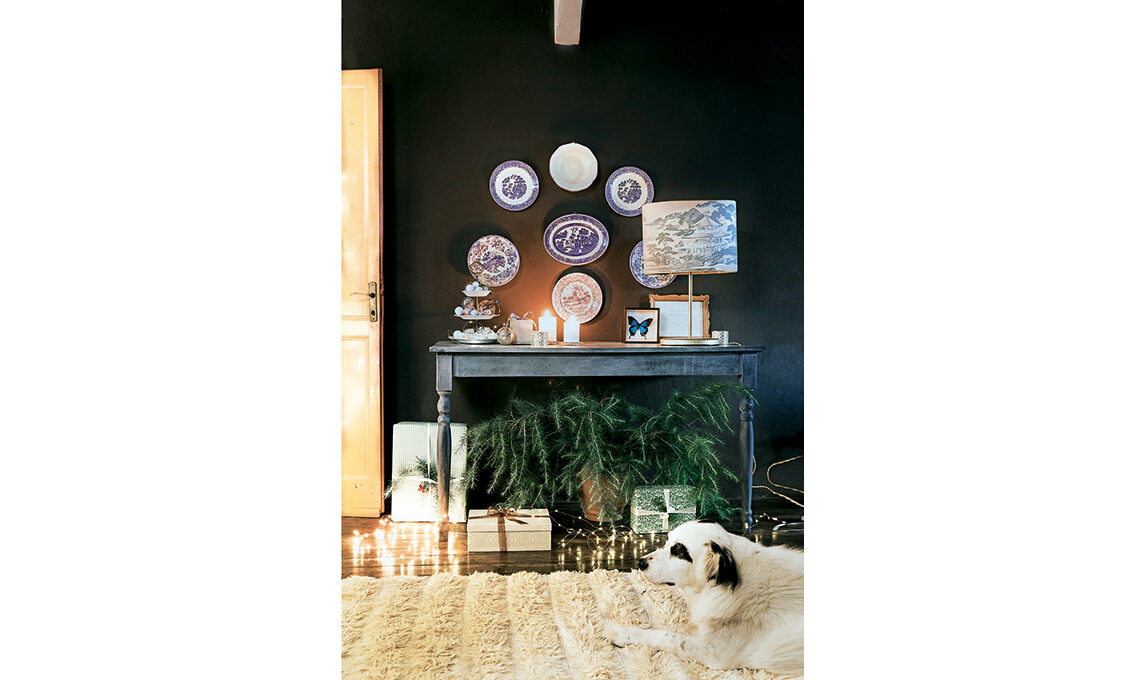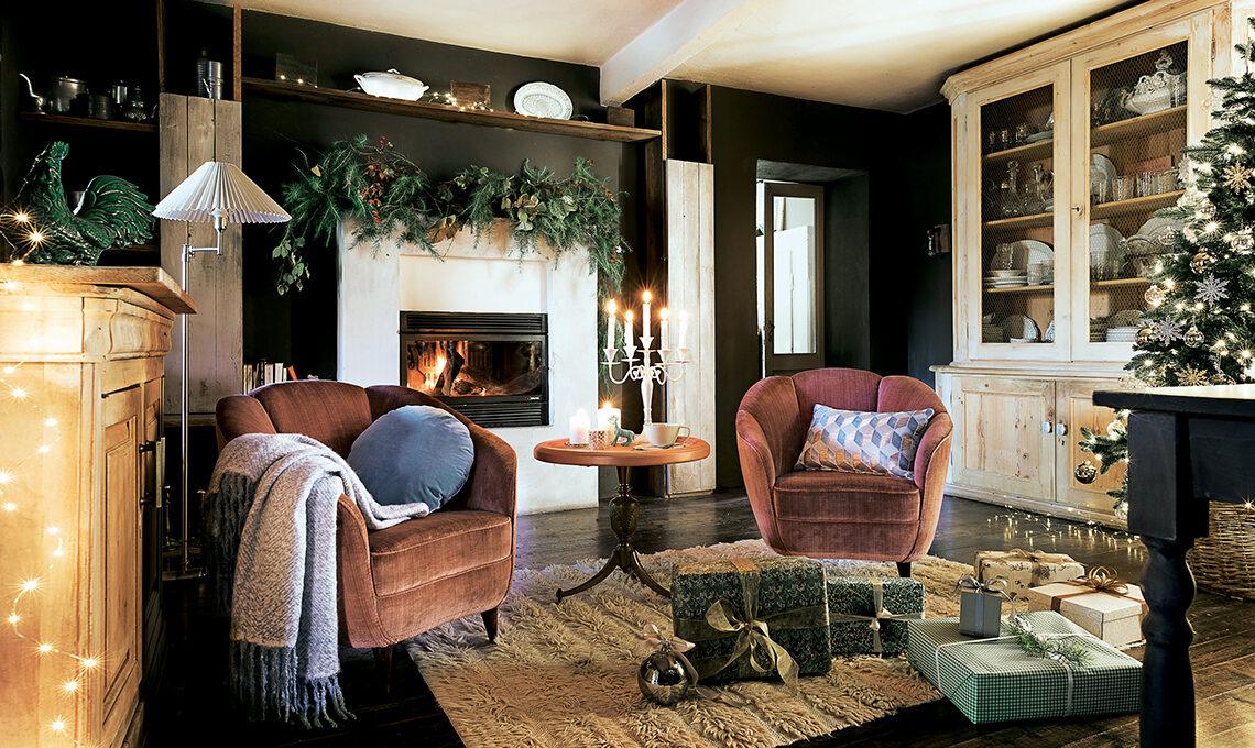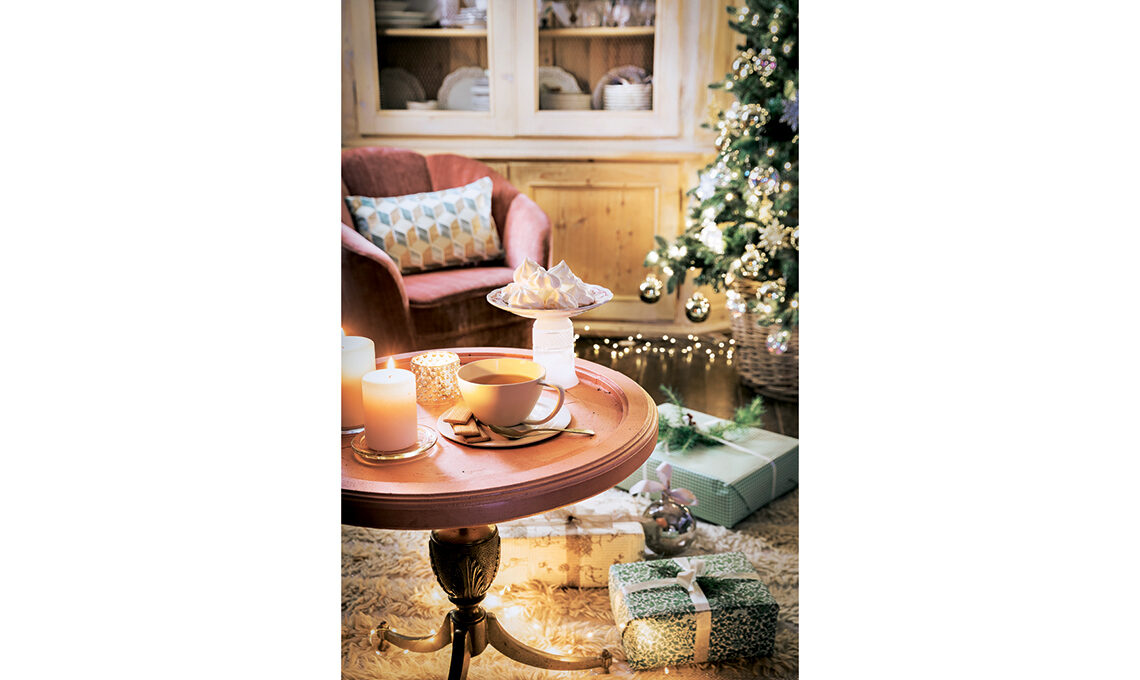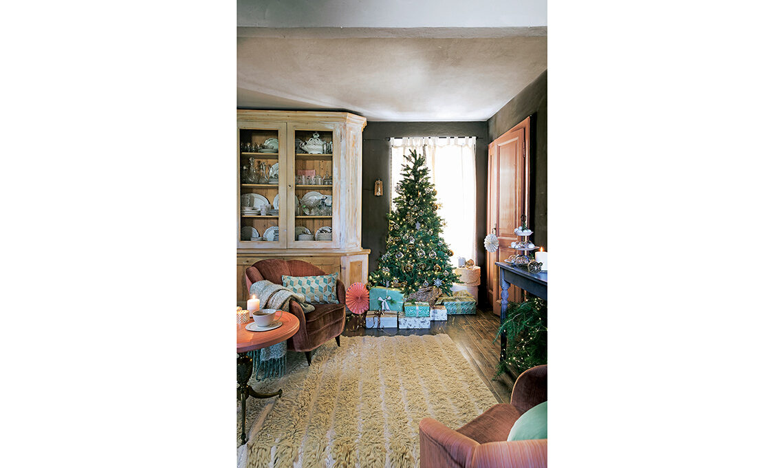 Poltroncine Anni ’50 e cuscini in velluto [Nuance], plaid [Croff € 32,99], lampada da terra [Ikea, fuori produzione], pacchi realizzati con carta decorativa Quadretto Verde, Pavonata Verde Provenza Verde e Le Voci del Bosco [Tassotti]. Sul tavolino, tazza Onda Set Tè [Society Limonta € 85] più candelabro e candele [Croff].