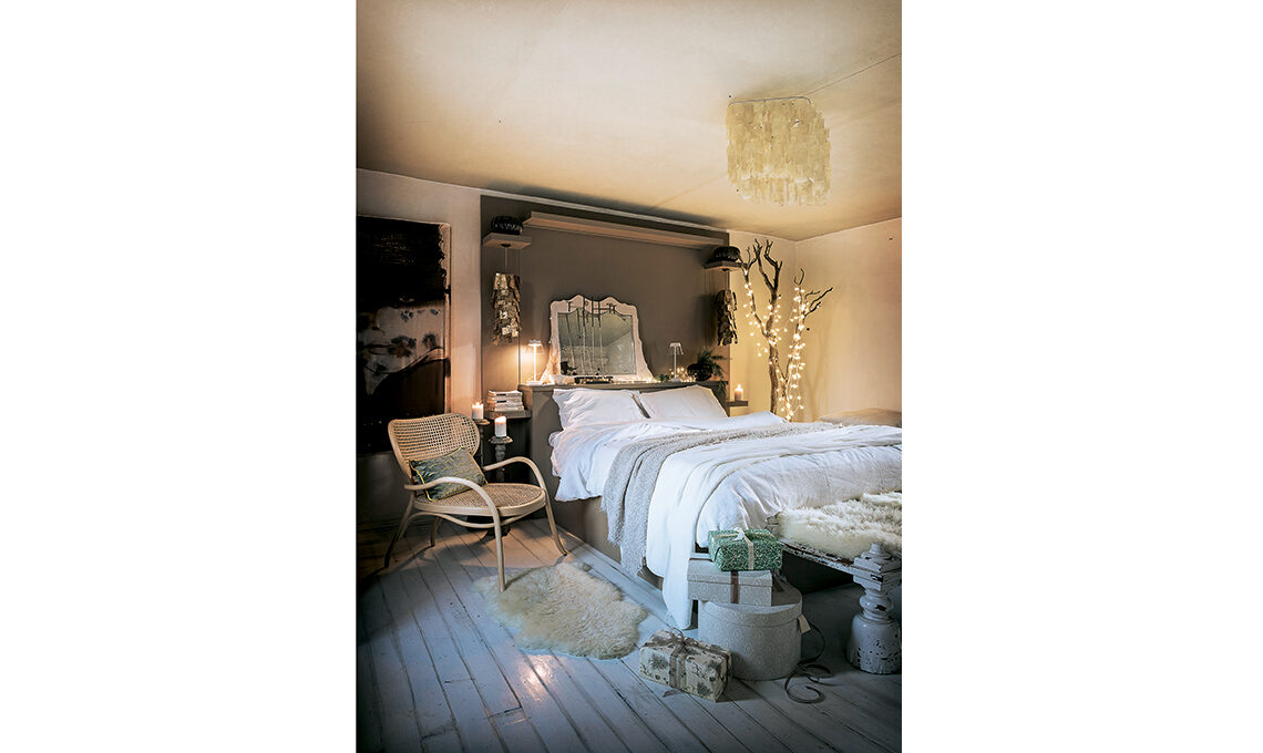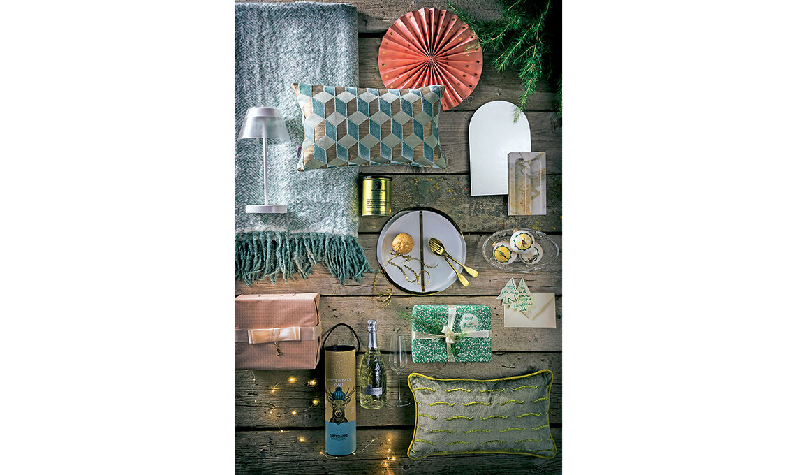 Plaid [Croff € 32,99], lampada Diaphanès [De Majo], cuscini [da Nuance], caffé in latta Moka 100% arabica macinato [Hausbrandt € 5,50], specchio Sinfonie con base in marmo Calacatta [Mille997], posate in acciaio satinato finitura Gold [Borgo delle Tovaglie €57/4pzi], sottopiatto e piatto Murano Gold [Les-Ottomans], panettone Classico A.D. 1476 Top Genesi [Loison], birra in confezione regalo Winter Beer [Theresianer