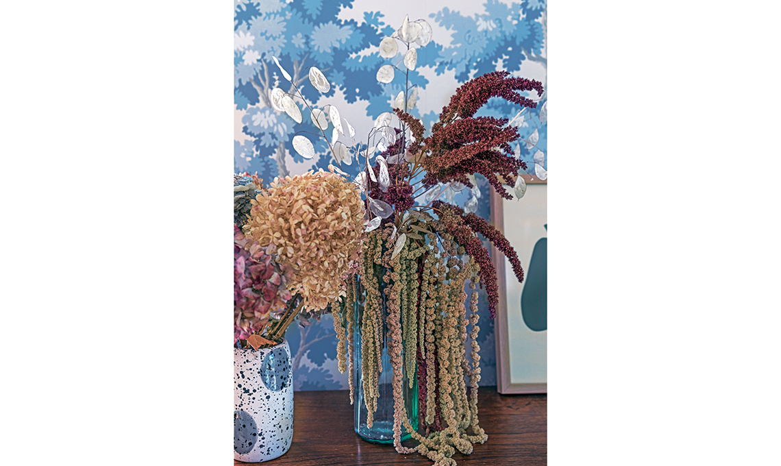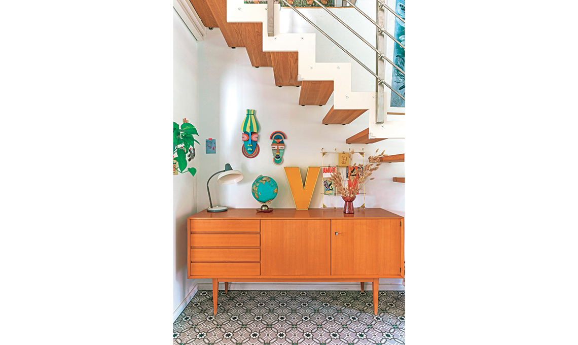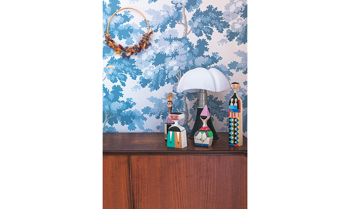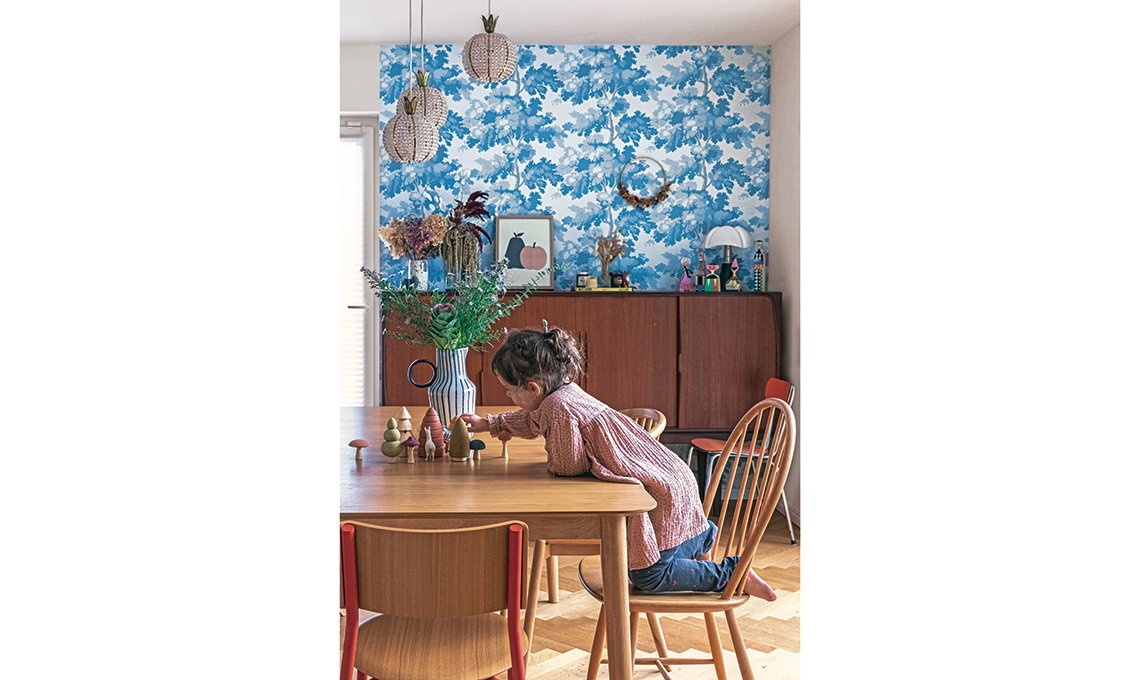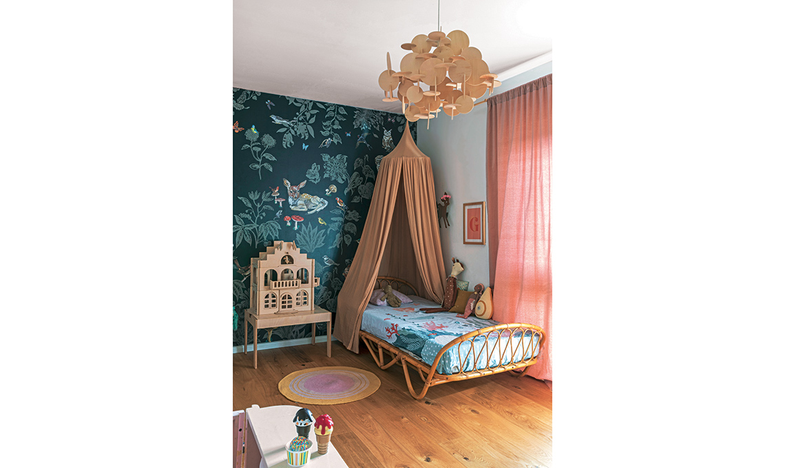 Il bow window, il parquet a spina e le cementine dialogano con le pareti decorate con la wallpaper, ghirlande di fiori e un mix di quadri e stampe. Lo stile? Boho, rivisitato con mobili di recupero accostati a pezzi di design.