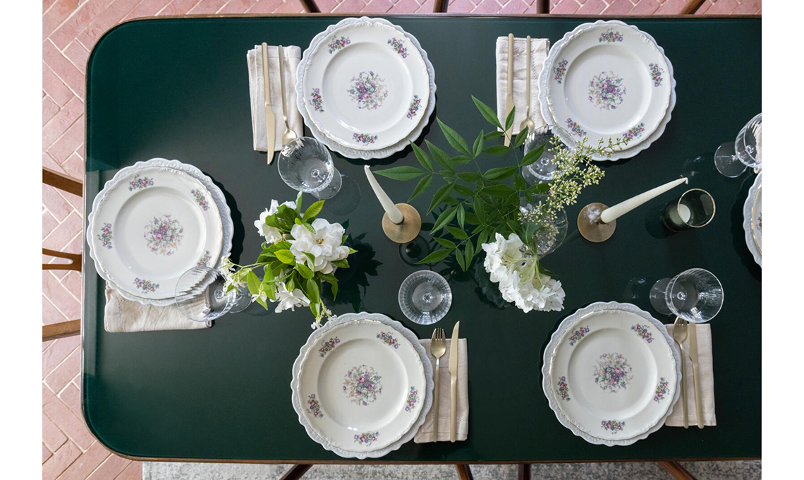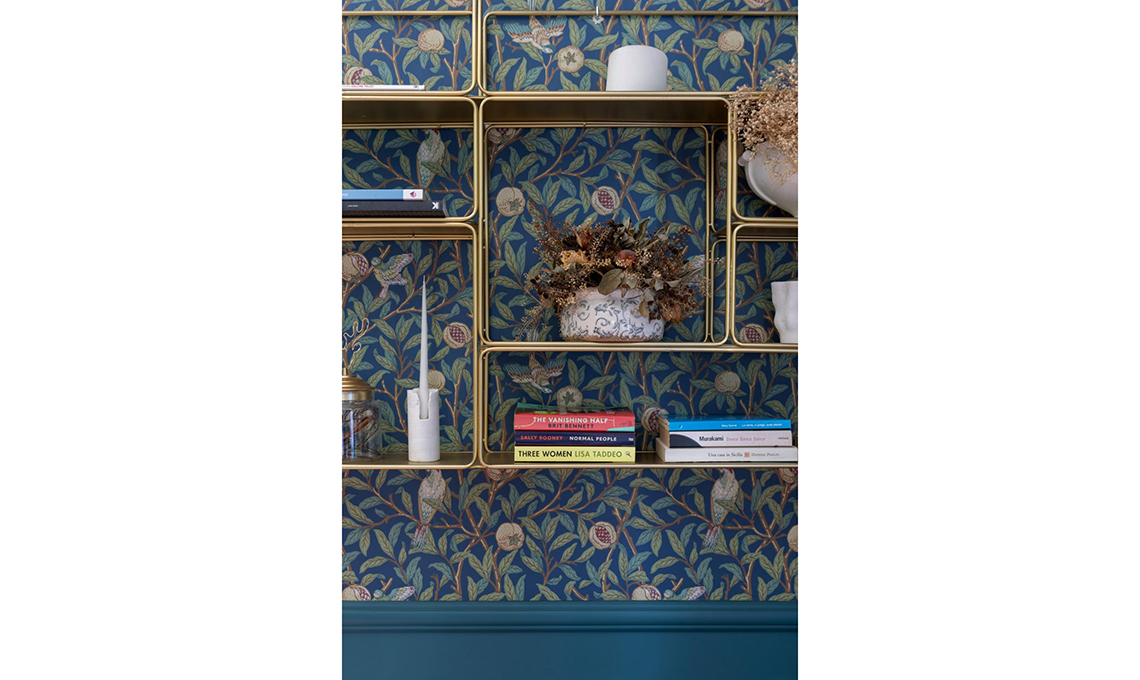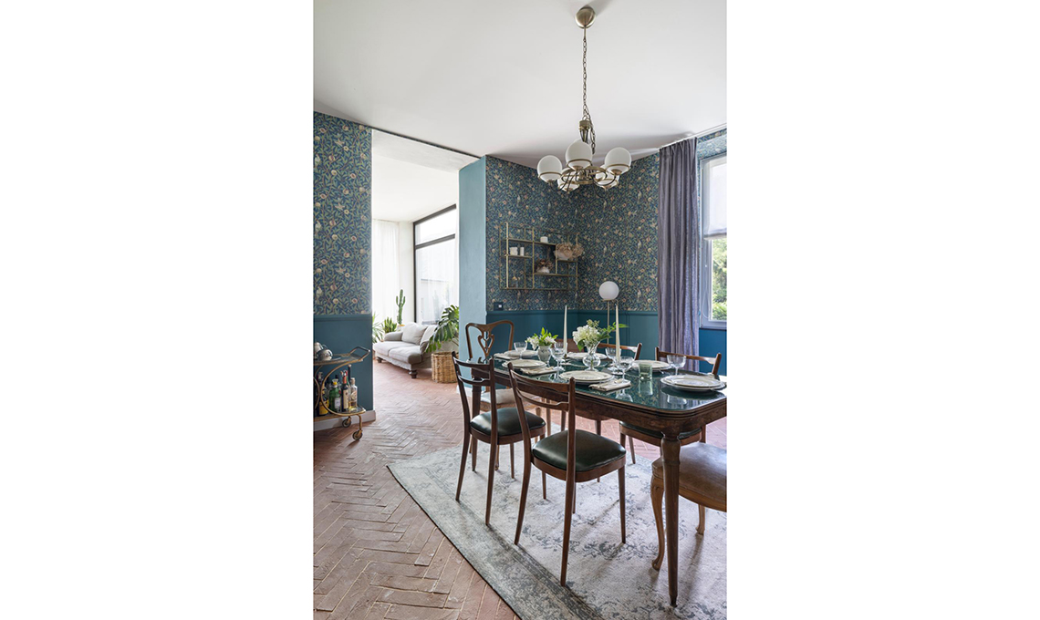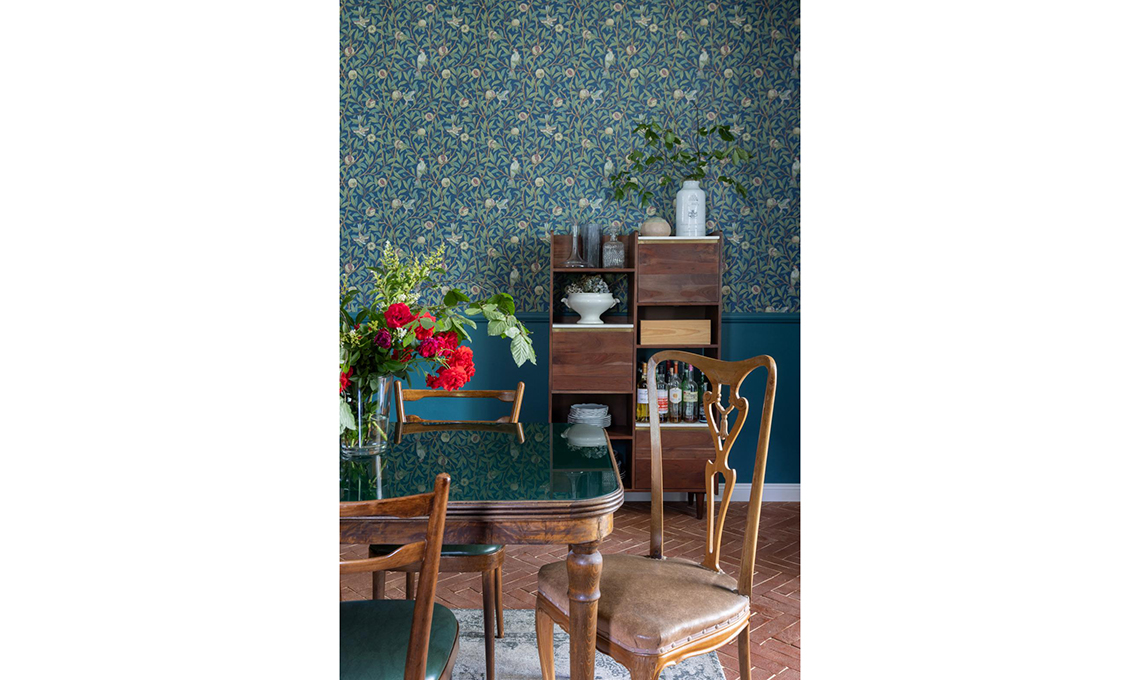 Carta da parati Bird & Pomegranate [Morris & Co.], lampadario Sphere Led [The Lighting Superstore]. Il tavolo e le sedie sono vintage. Puoi trovare delle belle tende di lino da [La Fabbrica del Lino]. A parete, pittura Pleat 280 [Little Greene].
