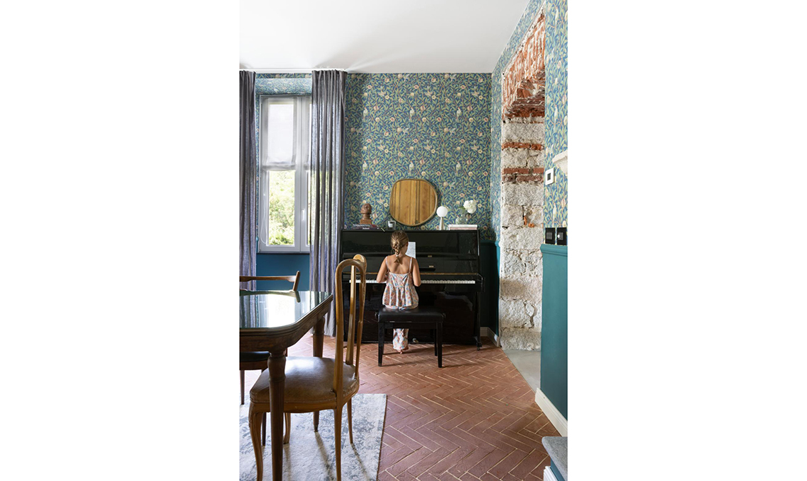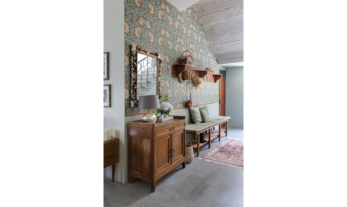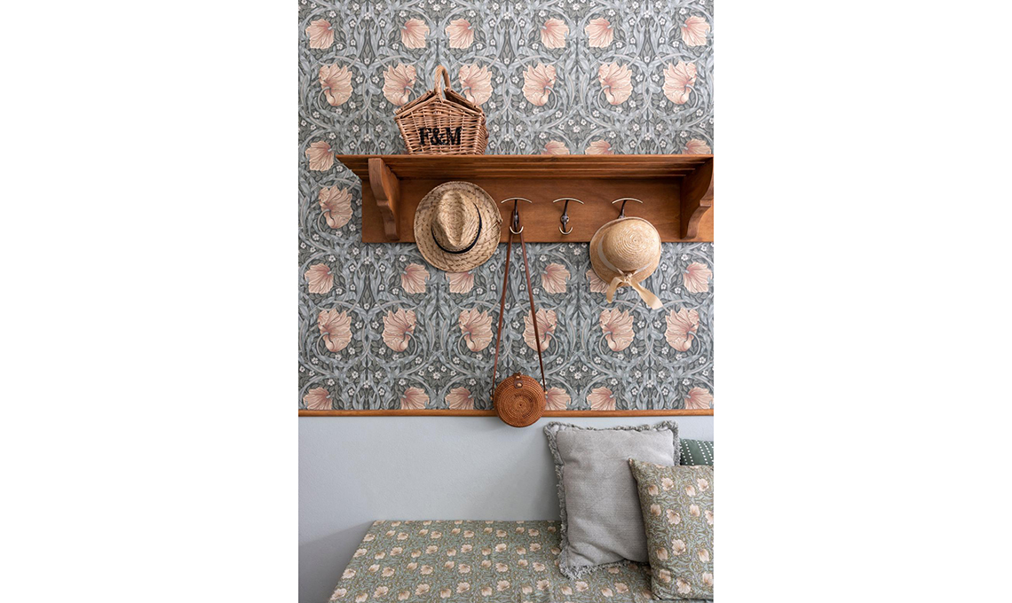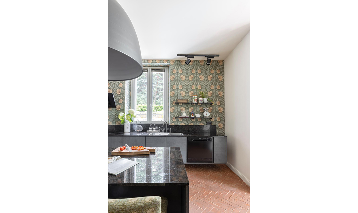 All’ingresso e in cucina, carta da parati Pimpernel [Morris & Co.]. cucina [Nova Cucina], sospensione Nur [Artemide]. Sgabelli Bergmund [Ikea] rivestiti, come il cuscino della panca, con un tessuto che ripropone il disegno della wallpaper.