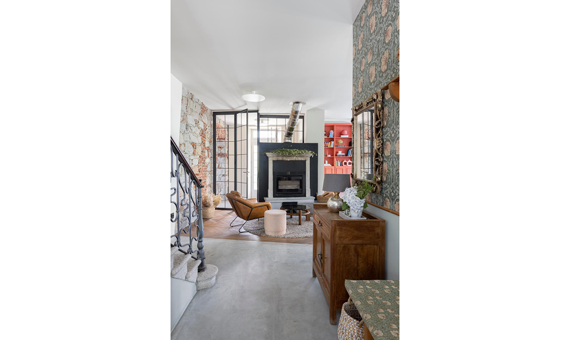 Una vetrata in ferro divide living e ingresso: davanti alla sua parte fissa, il camino è appoggiato a un setto murario realizzato ad hoc. Il fatto che la canna fumaria in questo modo fosse decentrata rispetto al focolare non ha rappresentato un problema, anzi:
