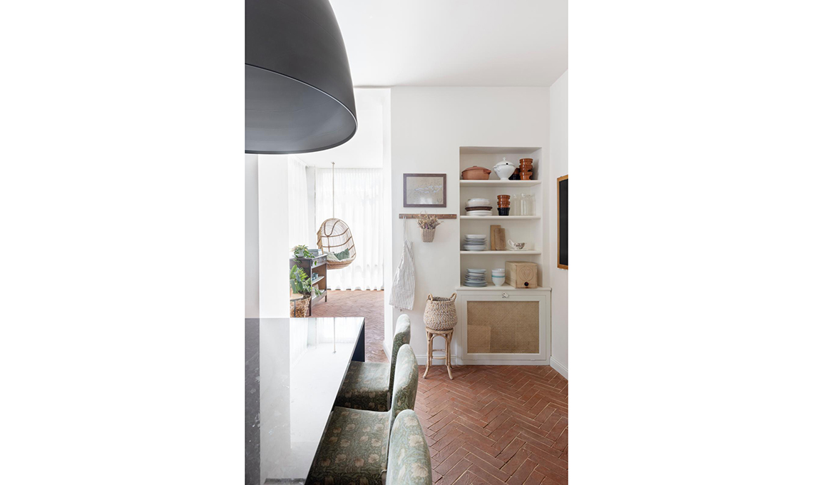 e in cucina è ripresa nei tessili di panca e sgabelli.