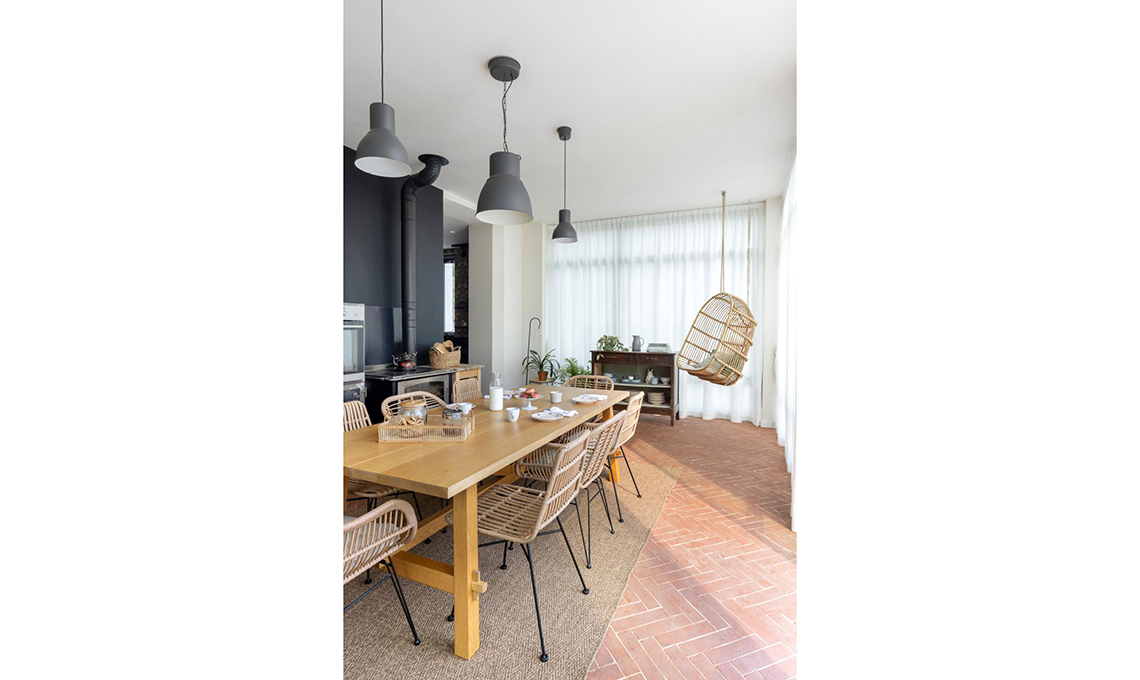Intorno al tavolo di rovere, le sedie in rattan e la stuoia in fibra di cocco aumentano il tasso di décor al naturale. La parete dipinta di grigio antracite, secondo il suggerimento dell’interior designer Eugenia Gourlay, spinge