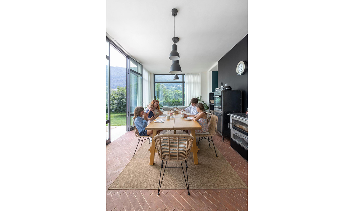 La veranda è l’unica parte che Nora e Ottavio hanno fatto realizzare ex novo. «Volevamo uno spazio dove i bambini potessero giocare, mangiare, colorare, sporcare senza restrizioni, ed è di fatto la parte che viviamo di più anche con