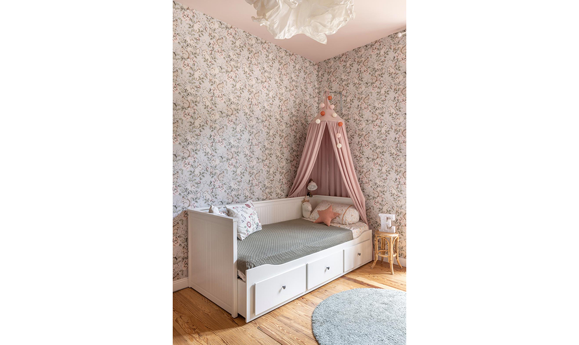 e Carelene [Kave Home]. Lampadario Krusning [Ikea], lenzuola [Zara Home]. La tappezzeria è Magic Forest [Boråstapeter].